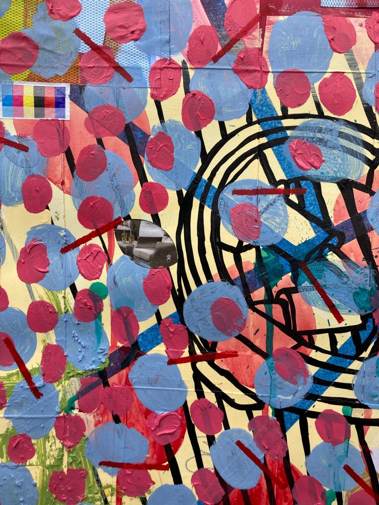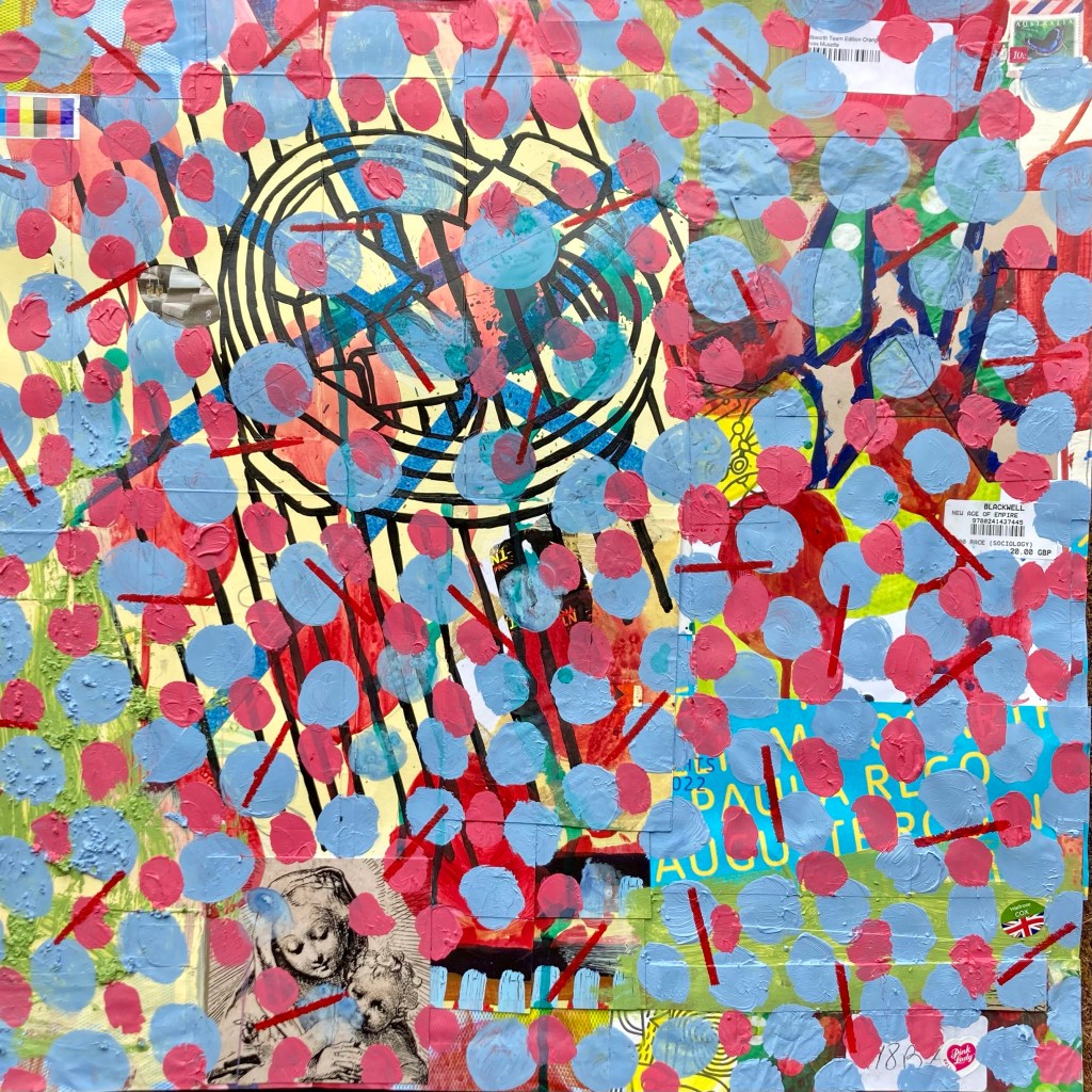 Acrylic paint on collaged paper patchwork with art magazines and famous artists 48cm x48cm